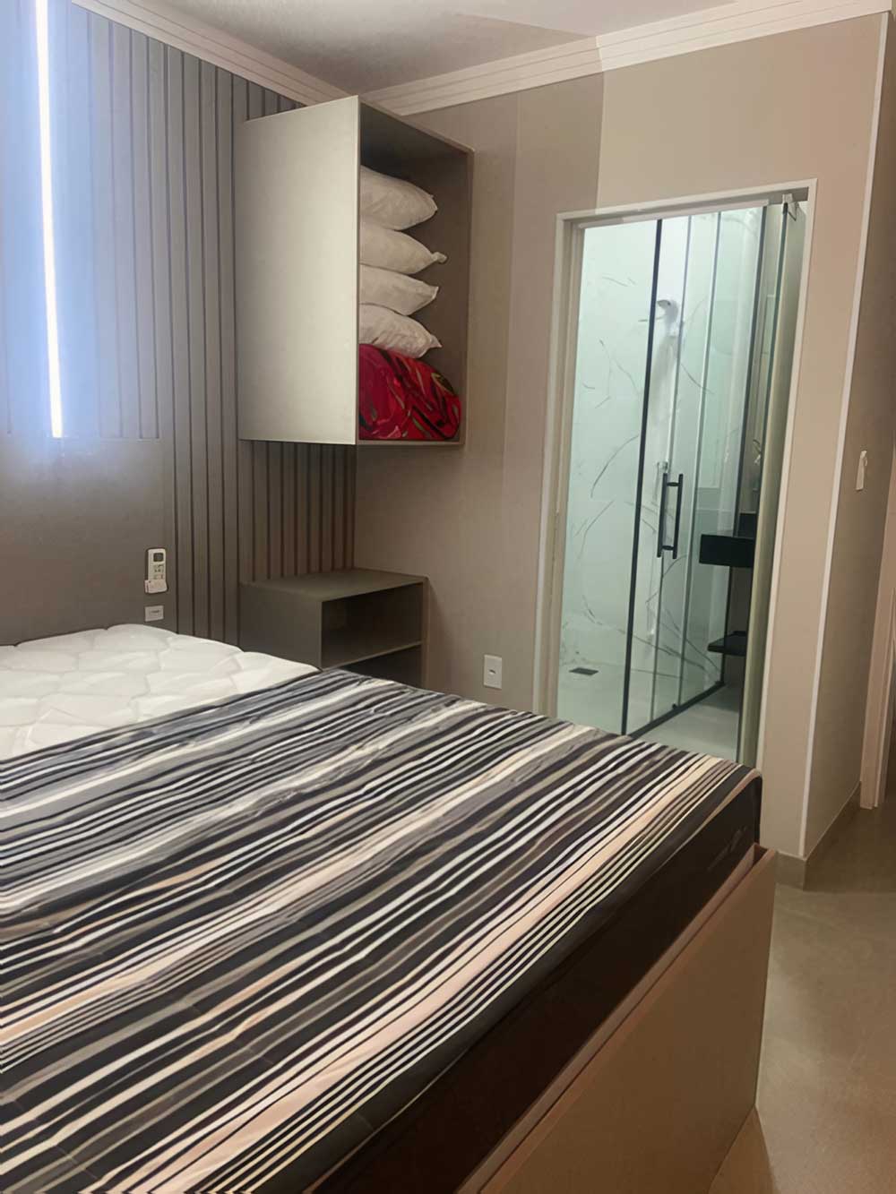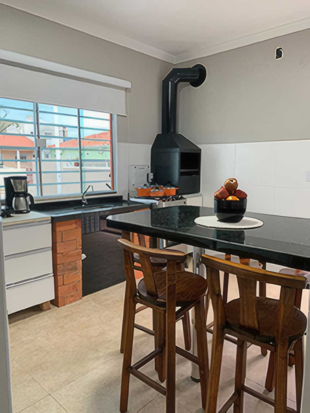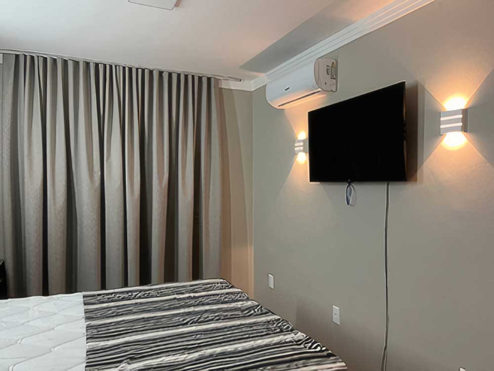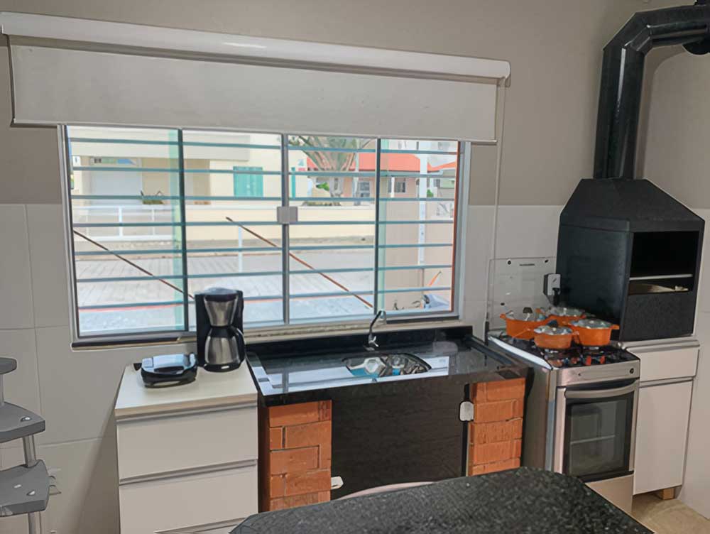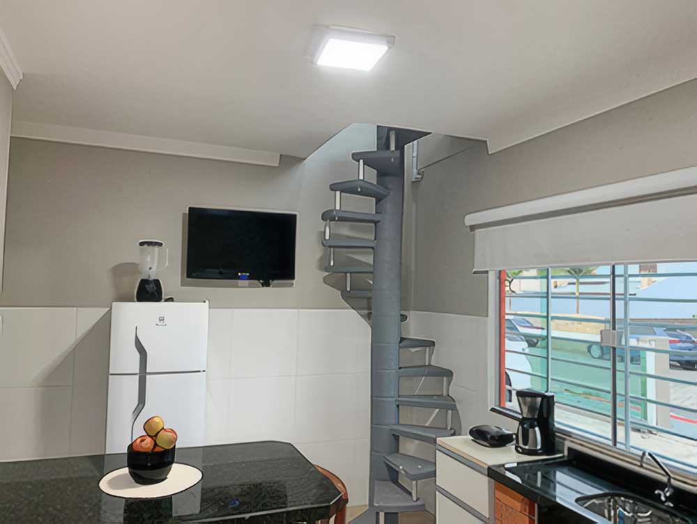 - Cozinha completa (com forno elétrico, microondas, churrasqueira, liquidificador, cafeteira, TV LED 42", cervejeira e geladeira com freezer)