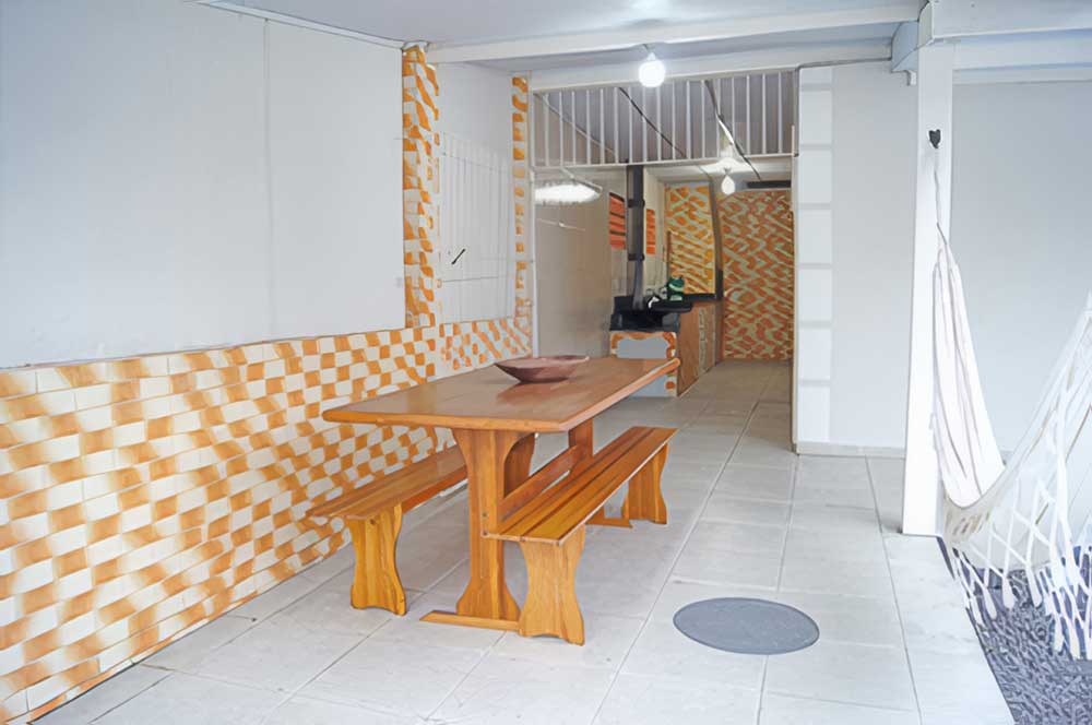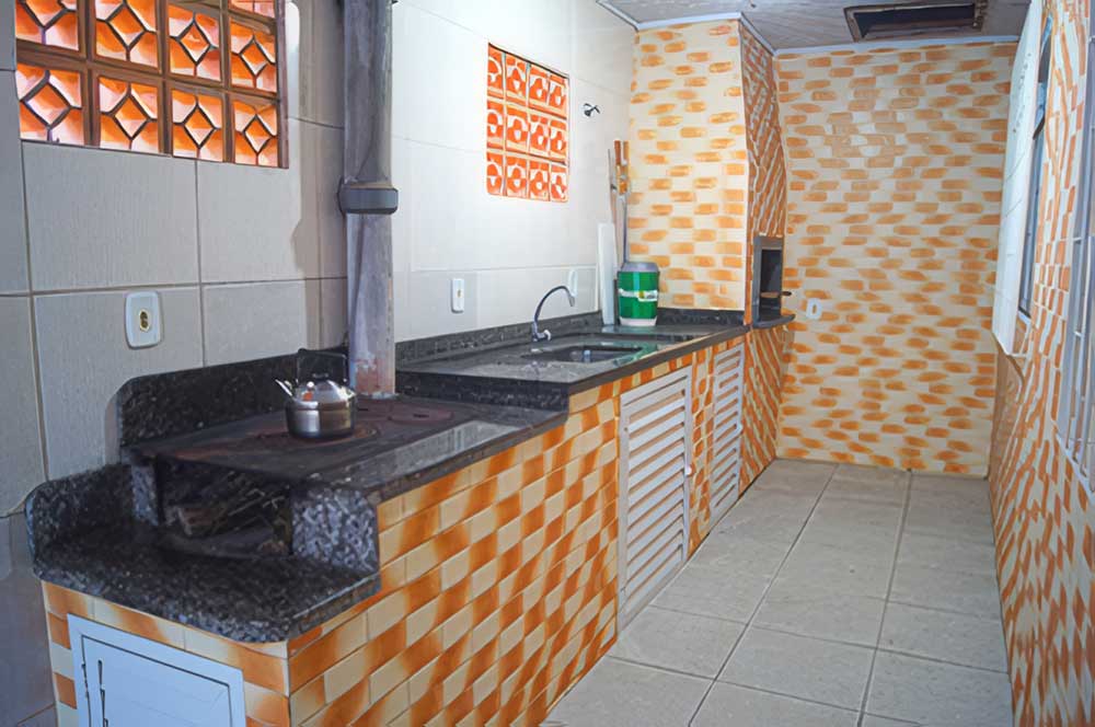 • Área de lazer coberta (com churrasqueira, fogão a lenha, mesa para churrasco, espetos, grelha, rede, 02 cadeiras de praia e 01 carrinho)