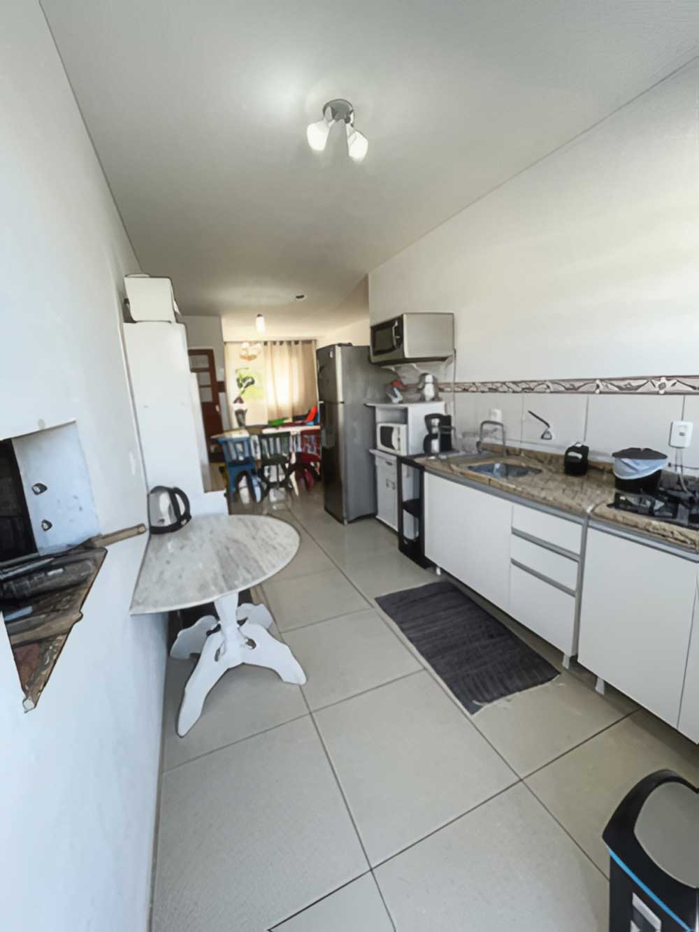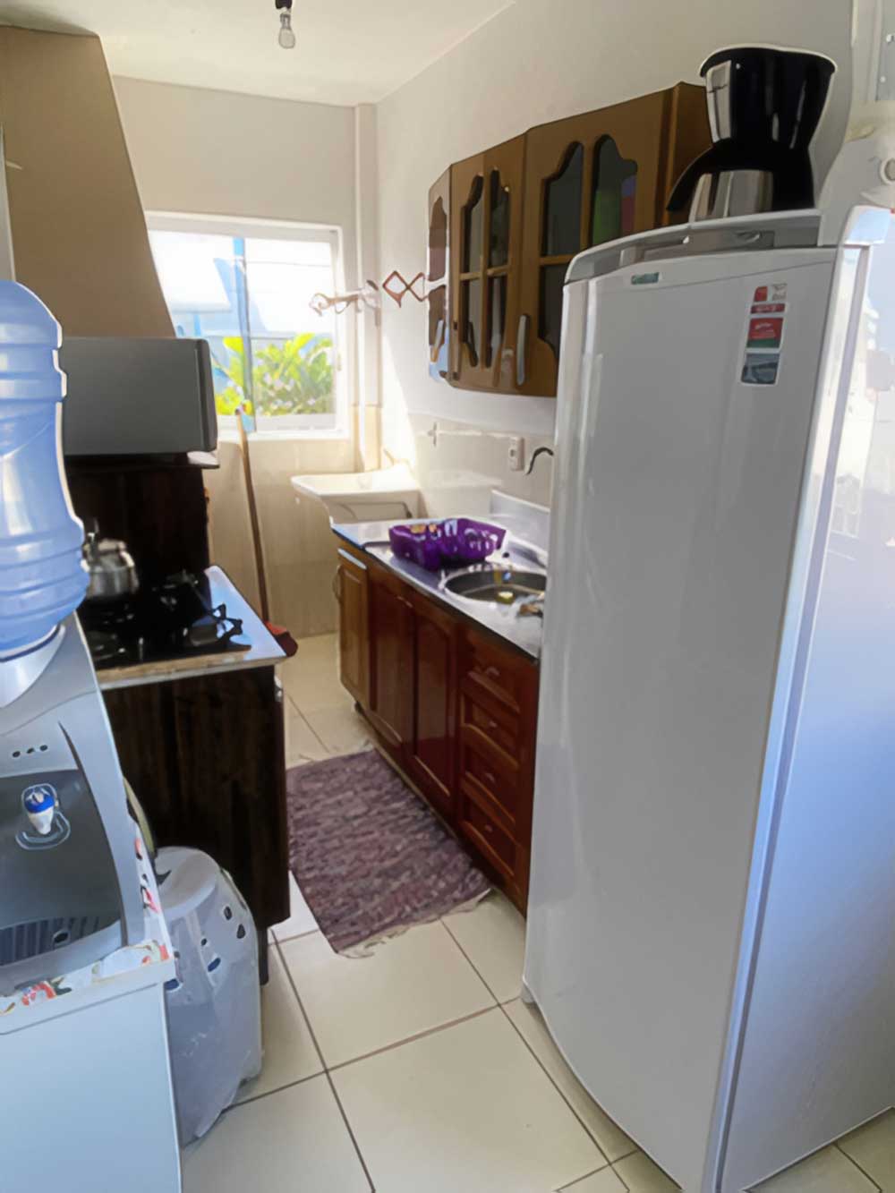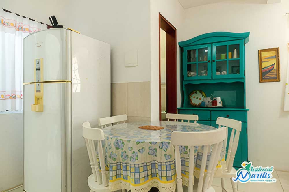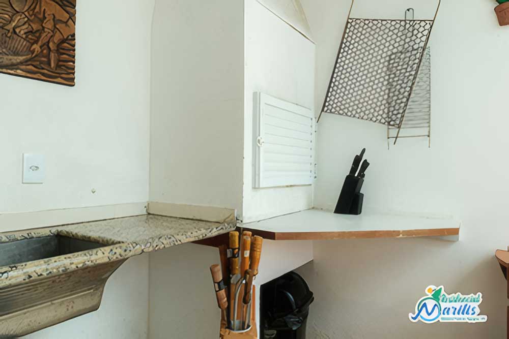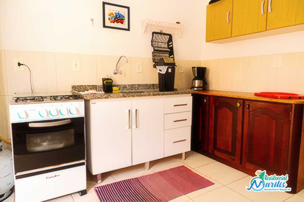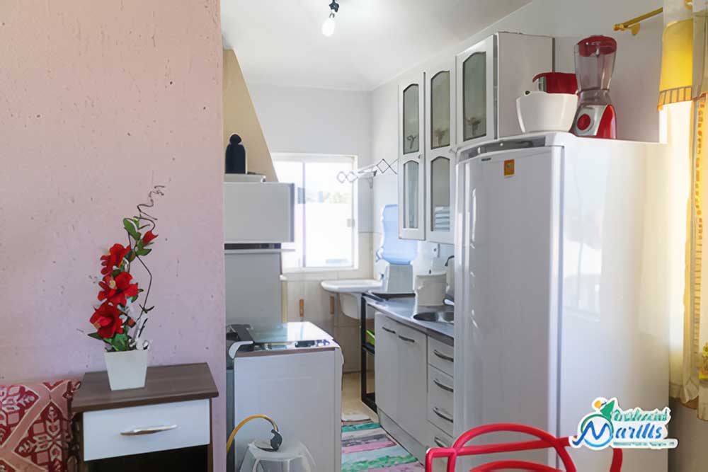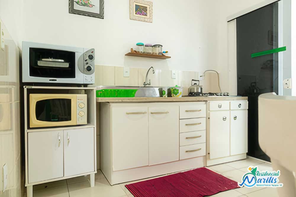 • Mobília básica completa: geladeira, fogão, churrasqueira portátil coletiva, máquina de lavar roupa (coletiva), forno micro-ondas, forno elétrico (coletivo – reservar), sanduicheira, cafeteira elétrica, liquidificador, batedeira elétrica (coletivo – reservar), 1 TV convencional (14’), ventiladores de teto na suíte e louças e utensílios de cozinha com panela de pressão