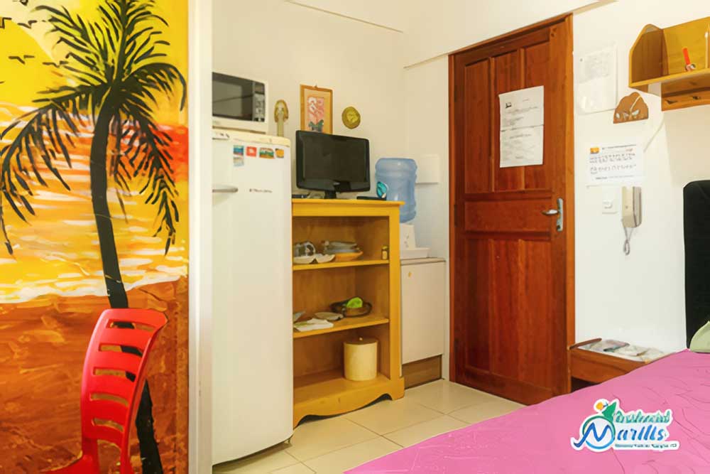 • Mobília básica completa: geladeira, fogão, churrasqueira, máquina de lavar roupa (coletiva), forno micro-ondas, forno elétrico (coletivo – reservar), sanduicheira, liquidificador, cafeteira elétrica, batedeira elétrica, 1 TV convencional (21’), ventiladores de teto no quarto de solteiro, ar-condicionado ou Split no quarto de casal, louças e utensílios de cozinha com panela de pressão