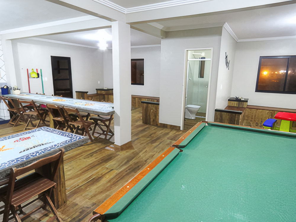 No mesmo espaço temos duas salas de estar, para reuniões e conversas animadas, mesa de snooker oficial e mini snooker, para seu lazer à noite ou em dias de chuva. Do lado de fora do espaço há um terraço para um gostoso banho de sol, tendo como pano de fundo aquela deslumbrante natureza. AMBIENTE FAMILIAR. |